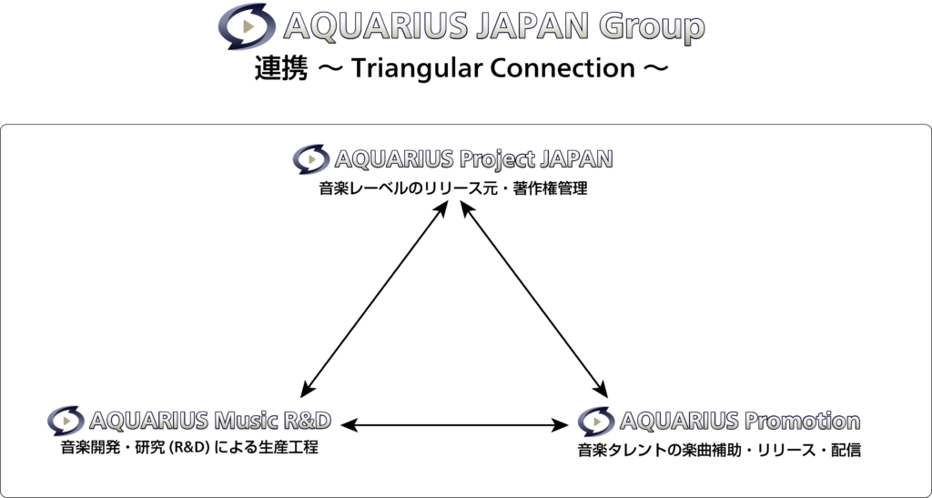 AQUARIUS JAPAN Groupは、音楽と映像、そして表現者たちを結びつけるトライアングルの連携構造を基盤としています。